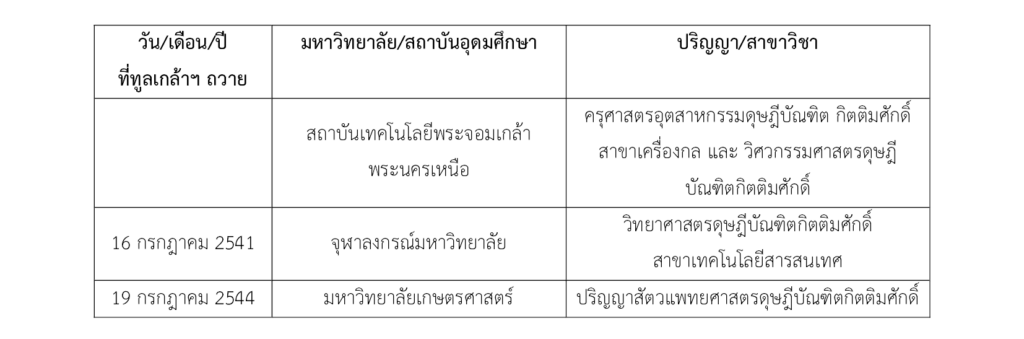 1. วันที่ 18 ตุลาคม พ.ศ.2515 ในวันพระราชทานปริญญาบัตร ได้ทูลเกล้าฯ ถวายปริญญาดุษฎีบัณฑิตวิศวกรรมศาสตร์กิตติมศักดิ์ (ในขณะนั้นยังเป็น 3 วิทยาเขต และ มหาวิทยาลัยฯ ได้รับพระราชทานนามว่า สถาบันเทคโนโลยีพระจอมเกล้า วิทยาเขตธนบุรี)