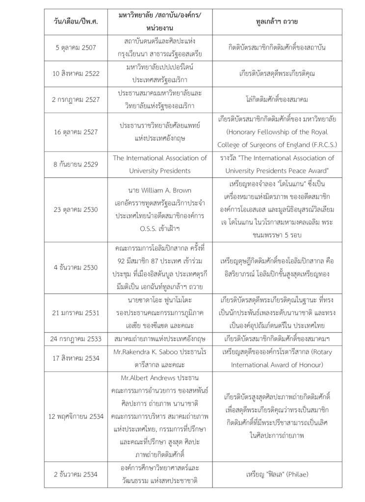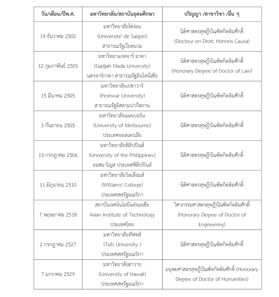 - 18.2 มหาวิทยาลัยต่างประเทศ ได้ทูลเกล้าฯ ถวายปริญญาดุษฎีบัณฑิตกิตติมศักดิ์ ตั้งแต่ พ.ศ.2502-พ.ศ.2529 ดังนี้