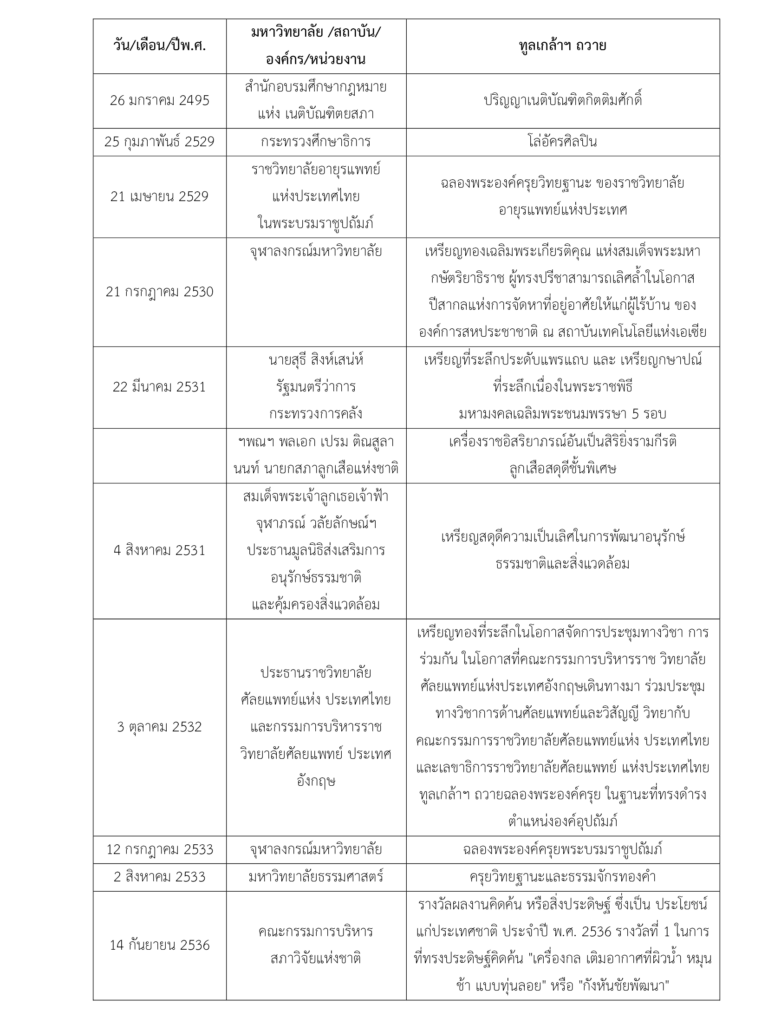 - 18.3 มหาวิทยาลัย สถาบัน องค์กร หรือหน่วยงานในประเทศไทย ได้ทูลเกล้าฯ ถวายเหรียญ โล่ เกียรติบัตรฯลฯ ดังนี้