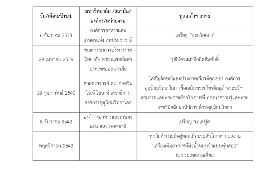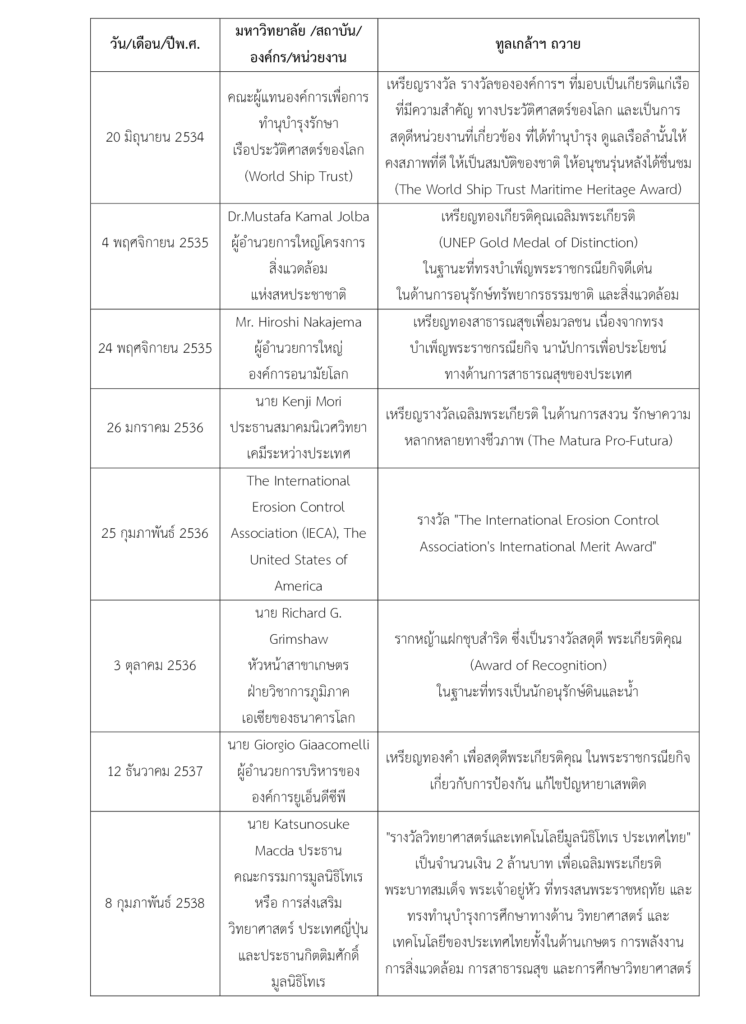 - 18.4 มหาวิทยาลัย องค์กร สถาบัน หน่วยงานในต่างประเทศ หรือระหว่างประเทศ ได้ทูลเกล้าฯ ถวายเหรียญ โล่ เกียรติบัตร ฯลฯ ตั้งแต่ พ.ศ. 2507 ถึง พ.ศ. 2543 มีดังนี้