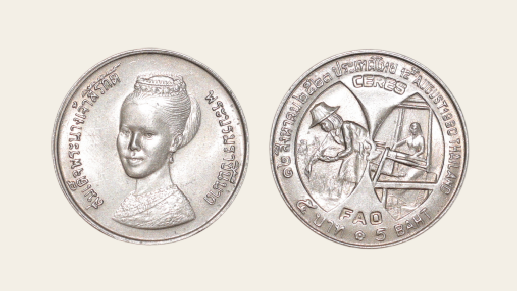 ในวันที่ 11 พฤษภาคม พ.ศ. 2522 องค์การอาหารและการเกษตรแห่งสหประชาชาติ (FAO) ทูลเกล้าฯ ถวายเหรียญเซเรส (Ceres Medal) ณ พระที่นั่งจักรีมหาปราสาท พระบรมมหาราชวัง เพื่อเฉลิมพระเกียรติสมเด็จพระนางเจ้าสิริกิติ์ พระบรมราชินีนาถ ในฐานะที่ทรงอุทิศพระองค์ในการพัฒนาชนบท เคียงข้างพระบาทสมเด็จพระเจ้าอยู่หัว (รัชกาลที่ 9) สู่การยกระดับทางเศรษฐกิจและสวัสดิการสังคม สนับสนุนพระราชกรณียกิจด้านการเกษตร ด้านหนึ่งสลักภาพสตรีสวมงอบ พร้อมจารึกข้อความ “To give without discrimination” หมายถึง การให้โดยไม่เลือกที่รักมักที่ชัง สะท้อนพระราชปณิธานด้านมนุษยธรรมอย่างเด่นชัด ต่อมา พ.ศ. 2523 จัดทำเหรียญกษาปณ์ที่ระลึกเพื่อเทิดพระเกียรติพระองค์ ดังภาพประกอบ