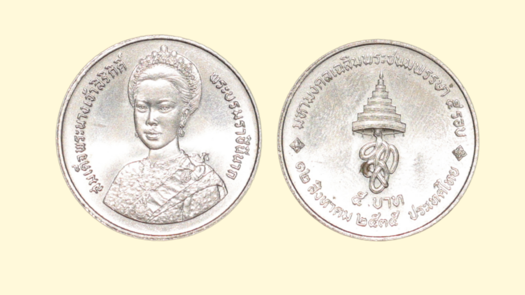 เพื่อเป็นการเฉลิมพระเกียรติและน้อมเกล้าฯ ถวายความจงรักภักดี ในมหามงคลสมัยที่สมเด็จพระนางเจ้าสิริกิติ์ พระบรมราชินีนาถ ทรงเจริญพระชนมพรรษาครบ 5 รอบ (60 พรรษา) ในวันที่ 12 สิงหาคม พ.ศ. 2535 กรมธนารักษ์ กระทรวงการคลัง (ประกาศใช้ 30 กรกฎาคม 2535) จัดสร้างเหรียญกษาปณ์ที่ระลึกซึ่งเป็นพระบรมฉายาลักษณ์พระพักตร์ของพระองค์แบบเดี่ยวมีทั้งที่เป็นเหรียญกษาปณ์ในราคา 2 บาท 5 บาท เหรียญเงินแท้ 600 บาท และเหรียญพระราชทานที่รู้จักกันในชื่อว่า “เหรียญไหม” เป็นเหรียญที่จัดสร้างขึ้นเป็นการเฉพาะเพื่อพระราชทานแก่ข้าราชบริพาร ผู้ทำคุณประโยชน์ และผู้ชนะเลิศการประกวดผ้าไหมในโครงการศิลปาชีพ