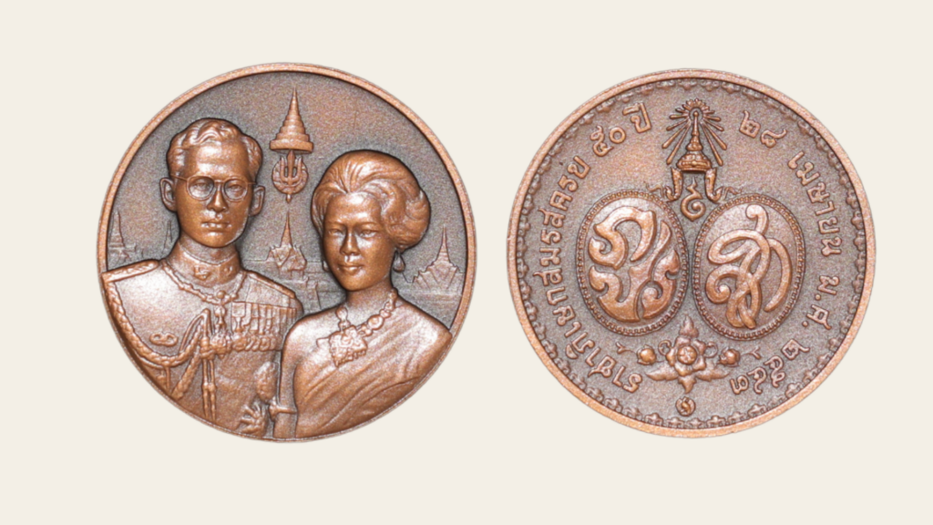 ในปี 2543 กรมธนารักษ์ได้จัดทำเหรียญที่ระลึกครบรอบ 50 ปีราชาภิเษกสมรส เพื่อเฉลิมพระเกียรติแด่ทั้งสองพระองค์ ขนาดประมาณ 3×3 เซนติเมตร