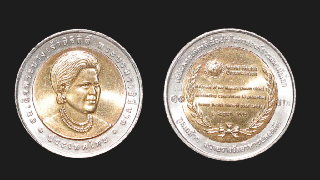 เหรียญที่ระลึกรางวัลอาหารปลอดภัยจากองค์การอนามัยโลก ปี 2548 เป็นเครื่องสะท้อนถึงเกียรติคุณของสมเด็จพระนางเจ้าสิริกิติ์ พระบรมราชินีนาถ พระบรมราชชนนีพันปีหลวง ในการทุ่มเทพระพละกำลังกาย ทรงงานด้านการพัฒนาอาชีพและความเป็นอยู่ของประชาชนมาอย่างยาวนาน โครงการพัฒนาอาชีพเสริมของพระองค์ช่วยให้เกษตรกรในชนบทมีรายได้เพิ่มขึ้น ไม่ต้องขายที่ดิน ไม่ต้องย้ายถิ่นฐาน สามารถพัฒนาวัตถุดิบทำกินของตนมาแปรรูปเป็นอาหารต่าง ๆ ผ่านภูมิปัญญาท้องถิ่นของตนเอง