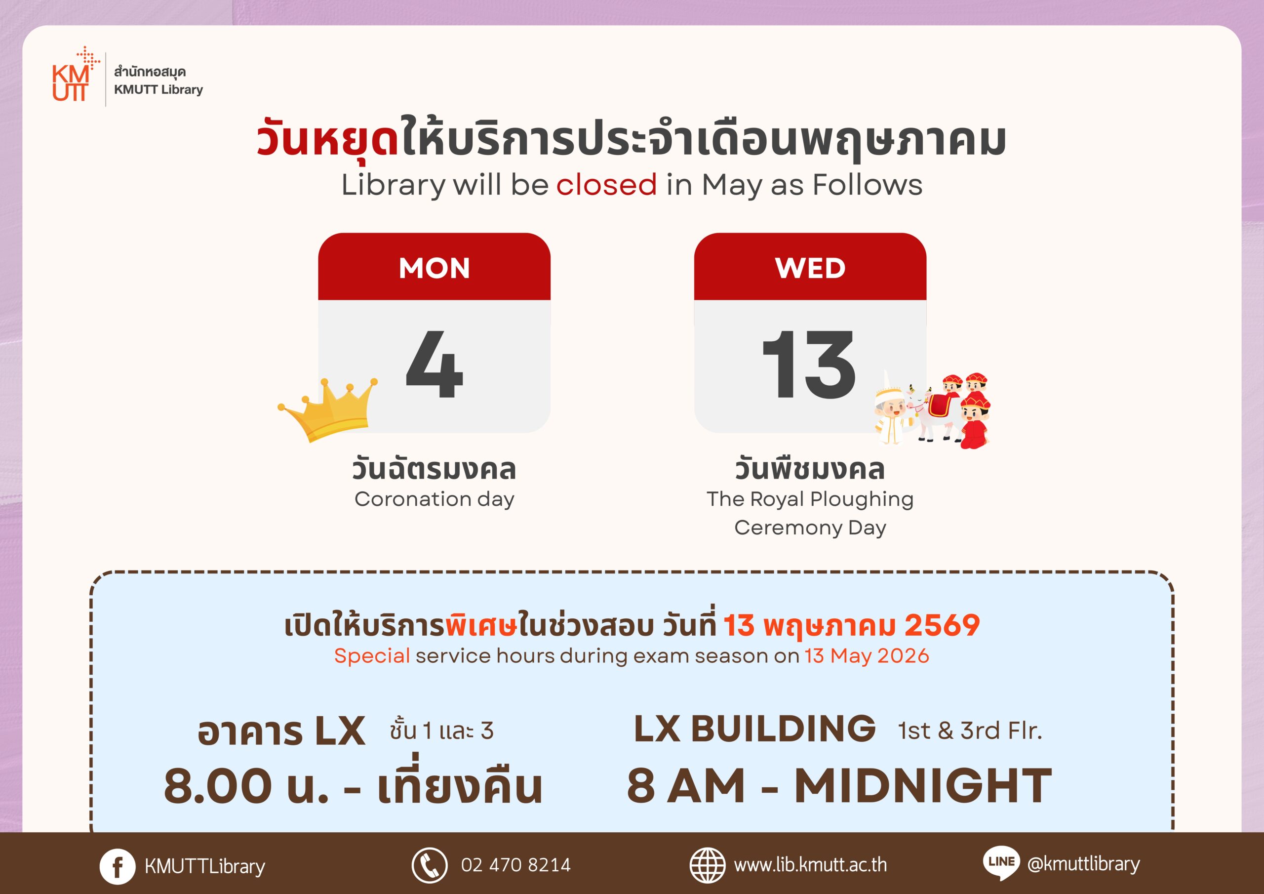 ข่าวประชาสัมพันธ์ ขอเชิญเข้าร่วมการสัมมนาออนไลน์ในหัวข้อ “The 9 stages of the research process” 🎓28 เมษายน, 2026 📢วันปิดบริการประจำเดือน พฤษภาคม 256928 เมษายน, 2026 📣ใช้ Coursera แล้วติดปัญหา? ฟังทางนี้เลย28 เมษายน, 2026 📢 ประชาสัมพันธ์ถึงคณาจารย์ นักวิจัย และน้อง ๆ ชาว KMUTT ทุกท่าน28 เมษายน, 2026 เหรียญแห่งเทคโนโลยีการพิมพ์และกษาปณ์ไทย ✨28 เมษายน, 2026 📚 ช่วงสอบนี้ มาอ่านหนังสือกันยาว ๆ ที่หอสมุด!31 มีนาคม, 2026 📚📖 อ่านหนังสือจนสมองจะเดือดแล้วใช่ไหม? 🔥23 มีนาคม, 2026 เปิดทดลองใช้งานฐานข้อมูล Royal Society of Chemistry (RSC) ได้แล้ววันนี้! 🧪✨18 มีนาคม, 2026 Load More